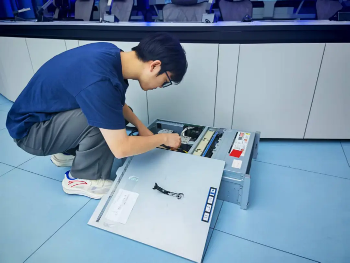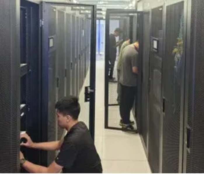 在涞水数据中心机房内,数字化团队正在调试设备,从硬件设备上架到软件参数配置,每一个步骤都严格把控,每一处细节都力求周全,团队成员加班加点,全力推进设备入场工作,实现涞水数据中心机房全面启用。涞水金山园区与北京八大处本部园区第一次实现办公网提速、研发网高速连通,顺利完成软件工厂应用部署,为全院科研软件研发提供高效、统一的数字化平台。